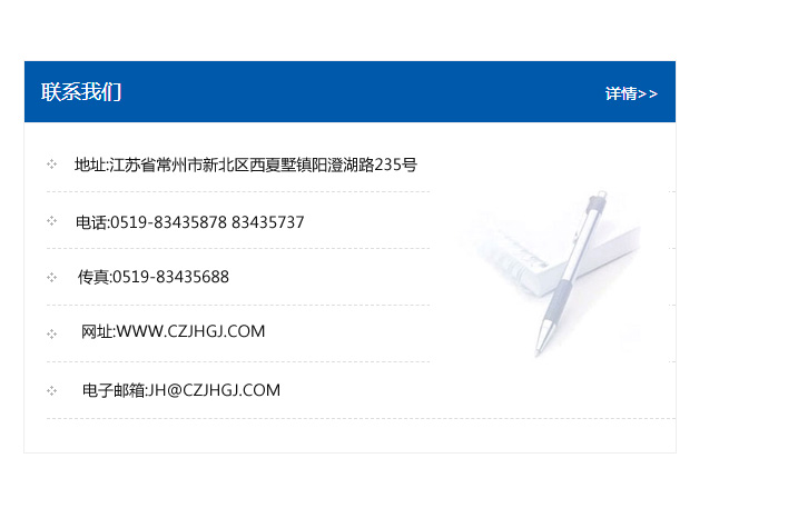 地址:常州市新北區友邦商務大廈1幢16、17層  電話:0519-85101652  傳真:0519-85112595  郵編:213022  網址:www.cz-jiayue_cn.sqhbgc.com  郵箱:xiajifengaa@163.com